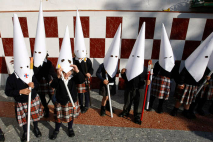 Colocarse el capirote o la mantilla (a veces confeccionados de forma casi profesional y otras veces recreados con cartón y bolsas de plástico) y desfilar en procesión por el patio del colegio e incluso por las calles más cercanas del entorno se había convertido en una actividad más en las vísperas de las Semana Santa en muchos centros escolares andaluces. Como ocurre con la programación vinculada a la Navidad, la dirección de los centros justifica estas representaciones como un reflejo de costumbres populares andaluzas más que como una celebración religiosa. Pero no todo el mundo lo ve así y la plataforma Sevilla Laica ha iniciado una campaña entre las familias para que muestren su rechazo a estas manifestaciones y fuercen su suspensión.