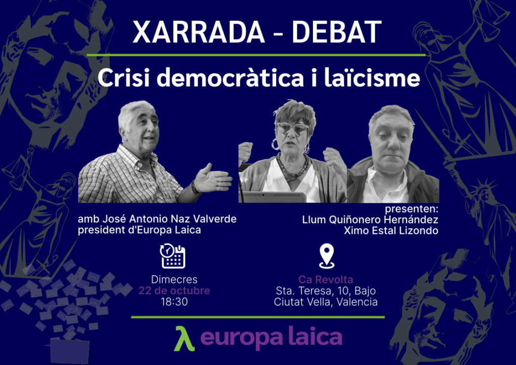 Europa Laica organitza el pròxim dimecres 22 d’octubre a les 18:30 h una xarrada-debat a Ca Revolta (València) amb el títol: «Crisi democràtica i laïcisme».