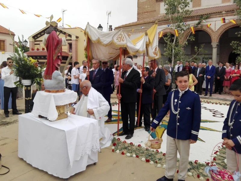 Fue una de las imágenes que dejó este día del Corpus, pero también el olor del tomillo, la custodia que bajo palio fue encaminándose hacia cada uno de los altares con sus alfombras (el primero correspondiente al Ayuntamiento y a la Iglesia, hecho con sal y café, y otros preparados por particulares), donde se escuchaban cánticos y se rezaba el Padre Nuestro, y los ‘enramajes’ que tradicionalmente se colocaban en las casas donde había mozas casaderas.