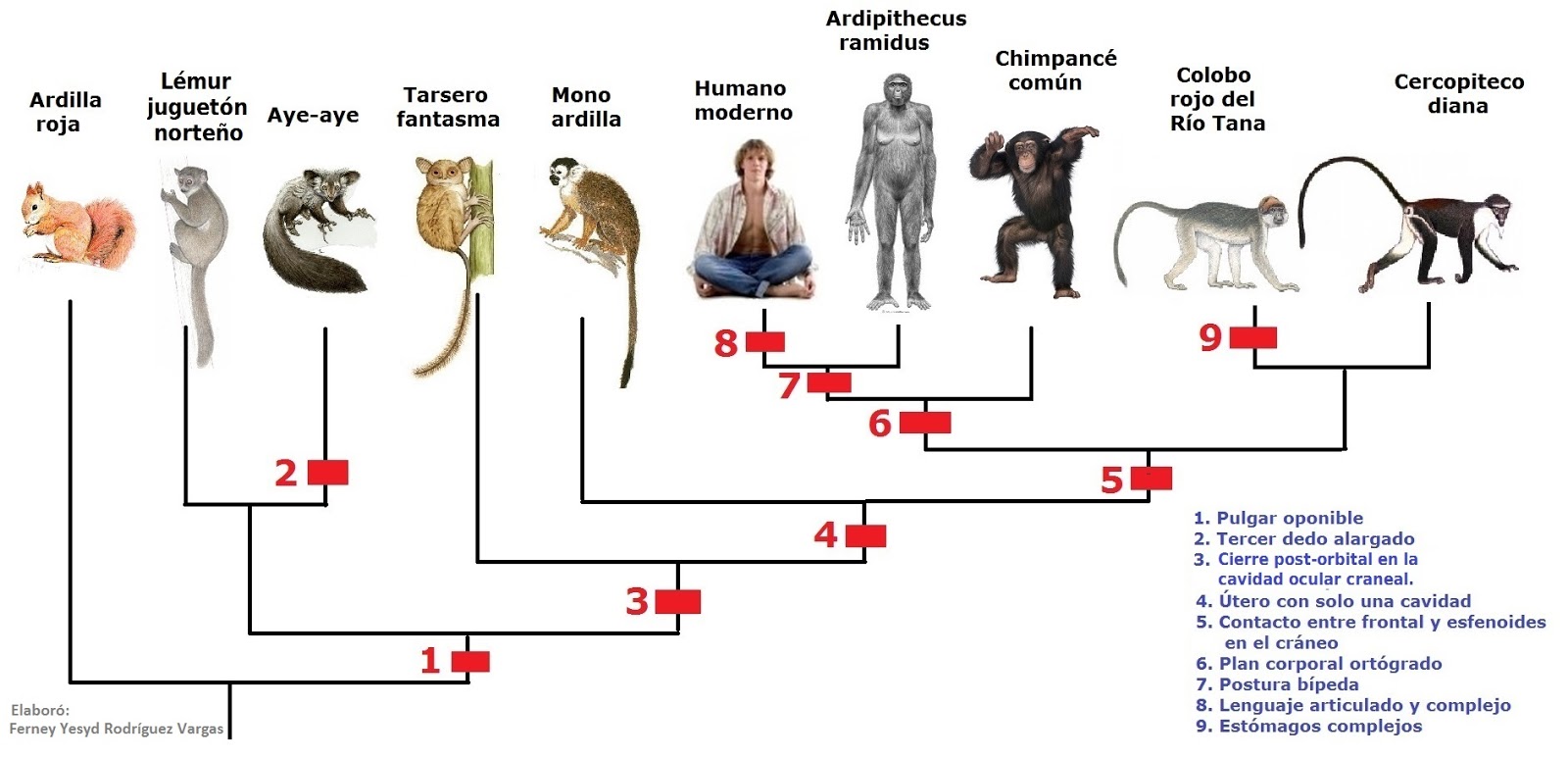 | Comparación de nueve especies de primates. Los números indican las características compartidas. La ardilla, un roedor, representa el grupo externo. |