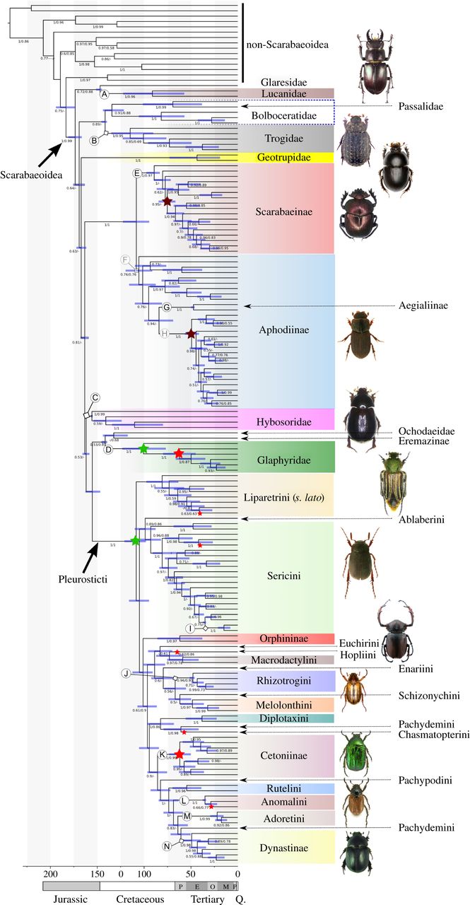 Pero lo anterior no ha ocurrido. Los hallazgos paleontológicos, que se hacen a diario, muestran una historia de la vida congruente con un aumento de la complejidad orgánica. En el campo de la genética vemos que todas las especies muestran relaciones genéticas. Para mencionar un caso concreto tomaremos a los escarabajos (Familia Scarabaideae). Recientemente Dirk Ahrens, Julia Schwarzer y Alfried P. Vogler compararon cuatro genes de diferentes especies de escarabajos y los compararon. Una computadora se encargó de comparar las secuencias de estos cuatro genes y generar un esquema de relación entre los diferentes grupos de esta familia. El resultado se puede ver en la imagen que acompaña este texto. Si la evolución no fuera cierta, el ADN no revelaría parentesco alguno. Bien podría ser más cercana a un ser humano una planta de acelga que un gorila, pero no es así. De hecho, la similitud entre secuencias de ADN es lo que se usa para determinar la paternidad responsable porque el ADN viaje de padres a hijos, y todos los cambios -mutaciones- que se den en su viaje por el tiempo, permite distinguir a unos linajes de otros.