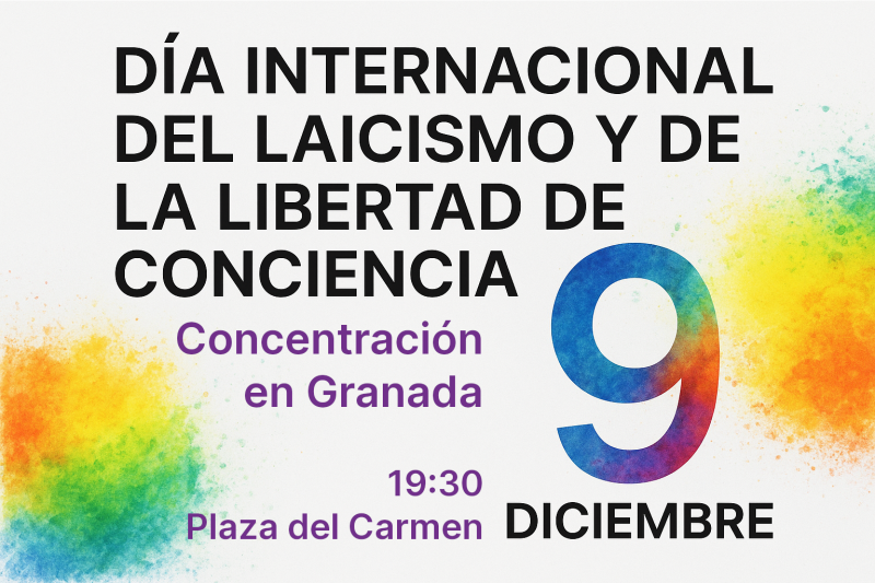 Granada Laica se concentrará el 9D en la Plaza del Carmen, para reivindicar la laicidad y la libertad de conciencia en el Día Internacional del Laicismo y la Libertad de Conciencia.