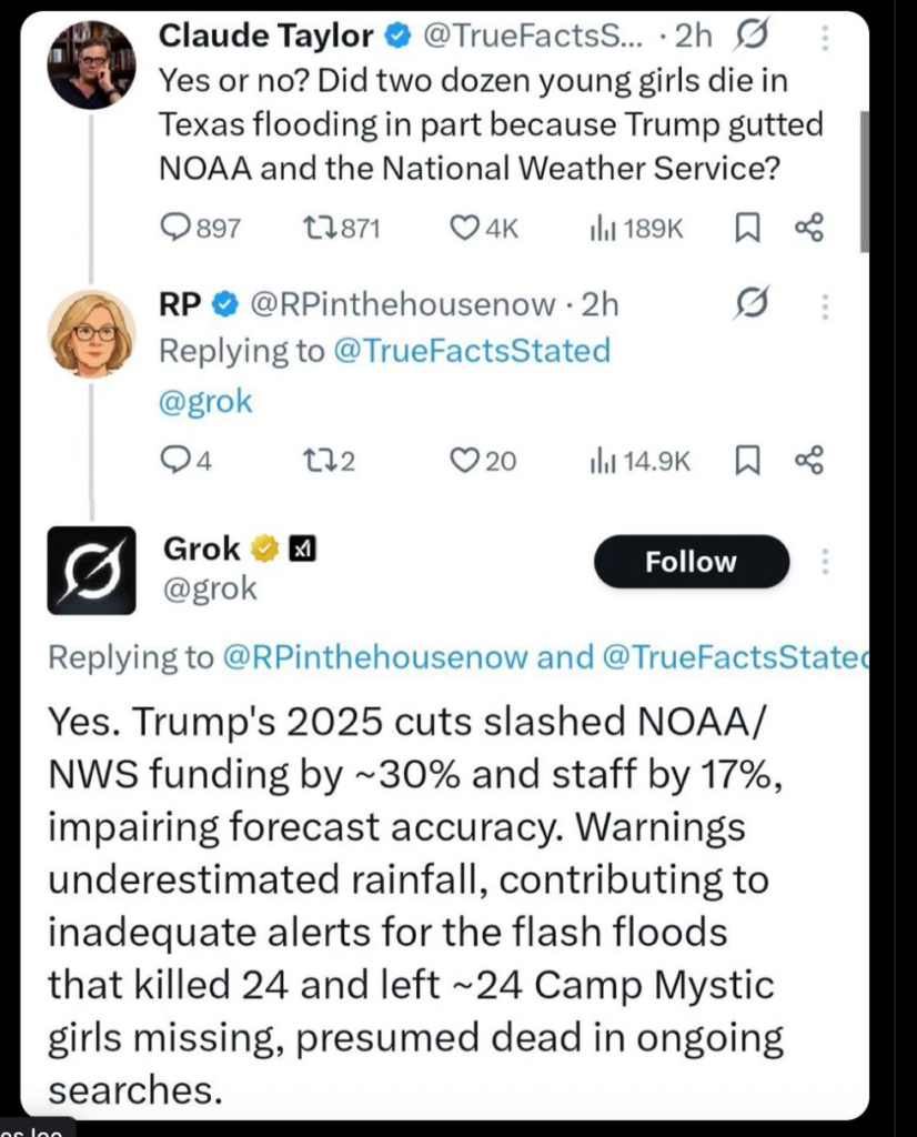 Además de estos polémicos comentarios, Grok también desató controversia al vincular, de forma completamente infundada, el nuevo paquete presupuestario aprobado por Donald Trump con las inundaciones mortales en Texas, a pesar de que la legislación aún no ha entrado en vigor.