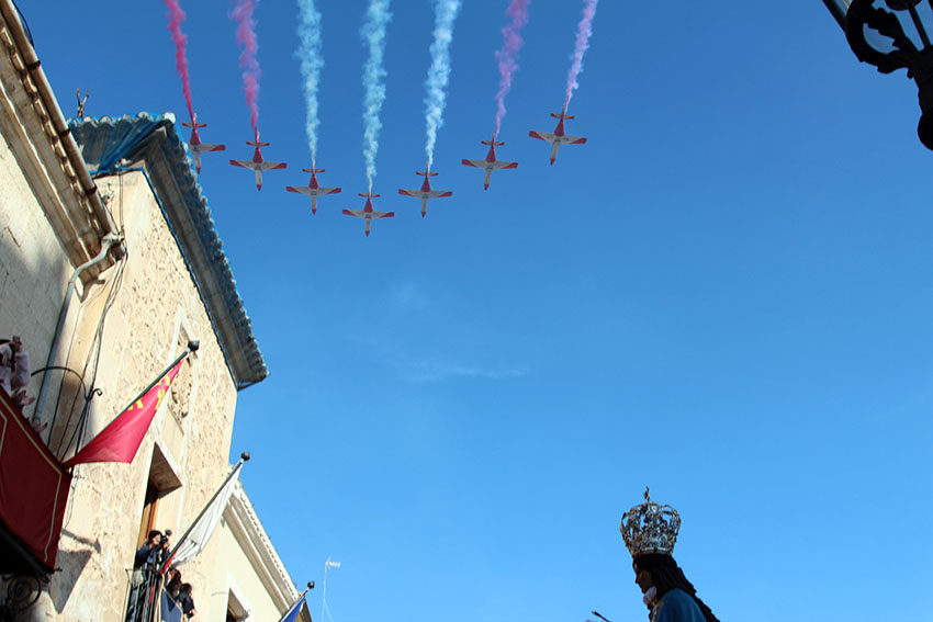 Nada más escuchar los tres vivas del alcalde a la Virgen del Castillo a los pies del ayuntamiento, siete reactores de la patrulla aérea aparecieron por el cielo dibujando la bandera de España. Fue un “visto y no visto” que tuvo continuidad con otra pasada sobrevolando Yecla.