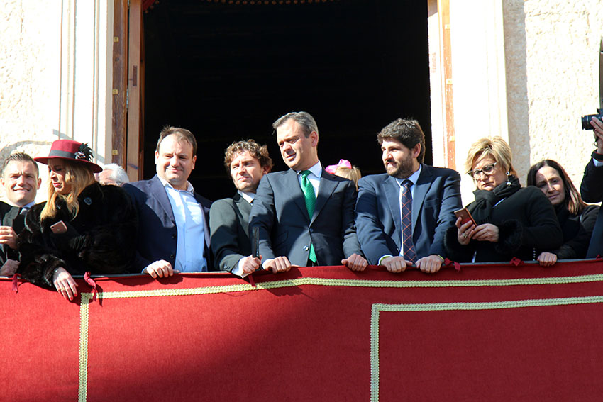 Desde el balcón abarrotado de personalidades, el Presidente de la Región de Murcia, Fernando López Miras que por la tarde participó junto a su pareja, la yeclana Juan María Alonso, en la ofrenda floral.