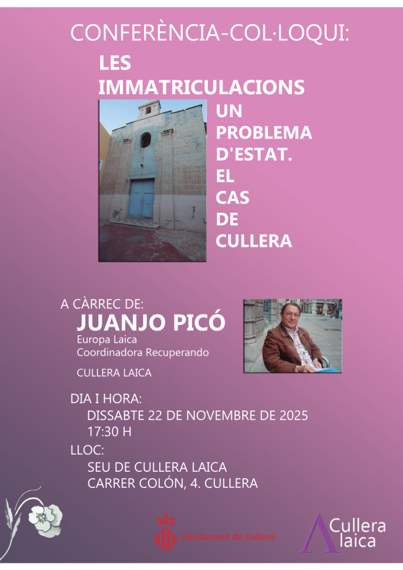 La Conferencia-col·loqui tindrà dues parts. Una primera, mes extensa, on Juanjo Picó, que fou expresident d’Europa Laica, abordarà el tema de les immatriculacions a Espanya: origen de l’espoli, com ha estat el seu desenvolupament, la situació actual, la problemàtica i quines son les propostes.