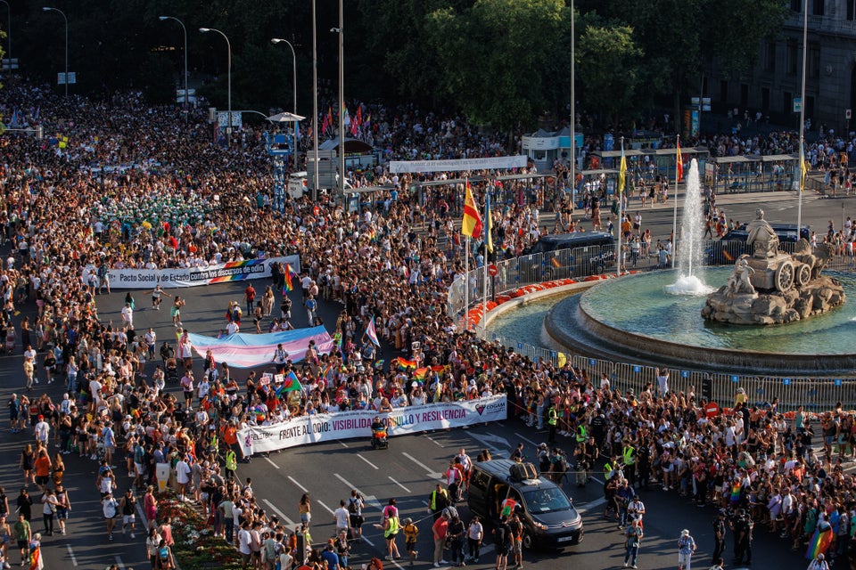 MADRID, SPAIN – JULY 09: Views from the Madrid City Hall of the attendees of the LGTBIQ Pride demonstration, on July 9, 2022, in Madrid, Spain. The march, organized by COGAM and FELGTB, and vindictive and festive in equal parts, runs through the center of Madrid to claim the right for the LGTBIQ collective. The event has, first, with banners and proclamations under the slogan «Facing hate: Visibility, Pride and Resilience», and then with floats. The demonstration is the main event of the Gay Pride 2022 week and has been held after two years of coronavirus pandemic. (Photo By A. Perez Meca/Europa Press via Getty Images)