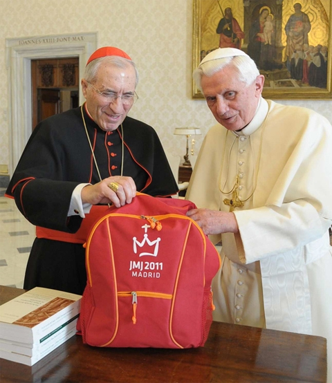 Rouco y Benedicto XVI con la mochila de la JMJ / Foto de la tienda on-line oficial habilitada por la Conferencia Episcopal Española