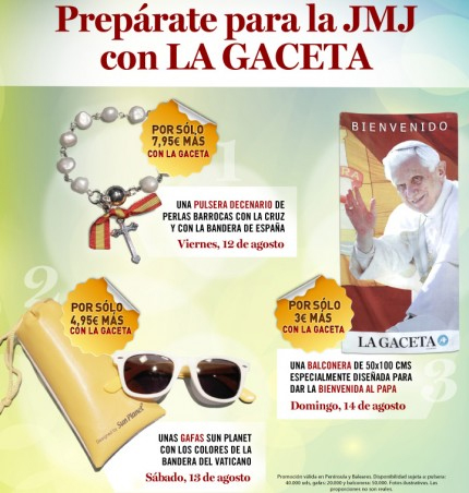 "Prepárate para la JMJ con 'La Gaceta'", anuncian estos días intensamente desde los medios del grupo Intereconomía. La campaña consiste en vender junto al diario diferentes productos, desde una pulsera con la bandera de España hasta unas gafas de sol con los colores vaticanos con las que poder ver al Papa "a pleno sol". El otro artículo del pack es una balconera para dar "la bienvenida al Papa Benedicto XVI" y que "puede ser tuya por sólo 3 euros". El merchandising del diario de Intereconomía compite así con el que también ha lanzado la Conferencia Episcopal para 'conmemorar' la visita papal.