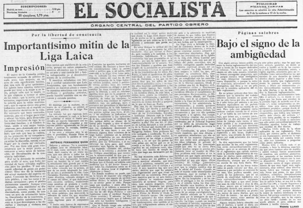 Hemos trabajado con el número 6783 de El Socialista. Sobre este mitin hemos escrito un artículo en El Obrero, y en la hemeroteca del mismo medio encontraremos más trabajos sobre la Liga Nacional Laica.