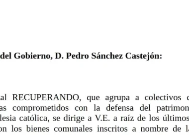 La Coordinadora RECUPERANDO insta al Gobierno a cumplir la PNL de 2017 sobre bienes inmatriculados RECUPERANDO pide a Pedro Sánchez una…